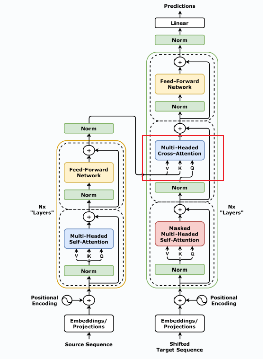 而交叉注意力机制很简单,只要将encoder最后一层的K和V矩阵用于每一层的decoder即可,其余部分与一般的多头注意力机制没有区别。
