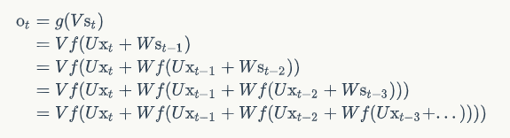 其中g( ⋅ )和f( ⋅ )函数均为激活函数。我们若将状态st不断使用公式进行展开就可以得到: