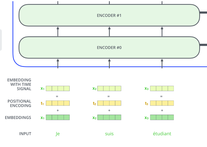 有了位置编码后,我们将输入向量x与其对应的位置编码相加就可以得到transformer的输入。