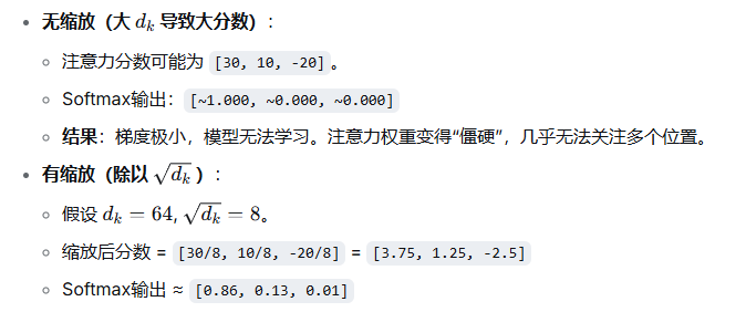 除了上述问题,在注意力机制中还除以了根号dk,是为了防止点积 QKT 随维度增大而数值过大,使 Softmax 的梯度过小,从而导致训练不稳定。本质是对点积进行标准化,使其在 Softmax 中保持适当的数值范围,避免梯度消失,稳定训练。下图给出一个具体的例子: