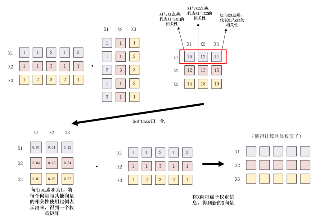 自注意力机制公示的本质可以看作是softmax(XXT)X,下面给出一个具体的例子,来探究该公式的具体意义。